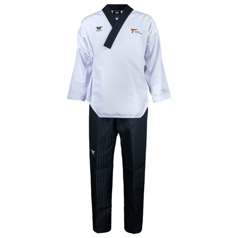Description: Terra Male Dan Poomsae uniform – Black collar – Dark blue trousers 160cm, 170cm, 180cm, 190cm, 200cm, 210cm